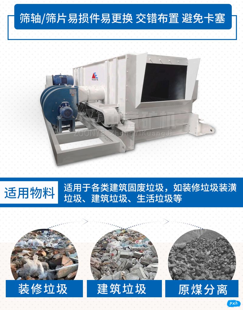 2、裝修垃圾處理設(shè)備根據(jù)裝修垃圾的物理特性或化學(xué)性質(zhì)(包括粒度、密度、重力、磁性、彈性等),分別采用不同的分揀方法,包括重力、風(fēng)力篩分等不同方式進(jìn)行綜合處理。