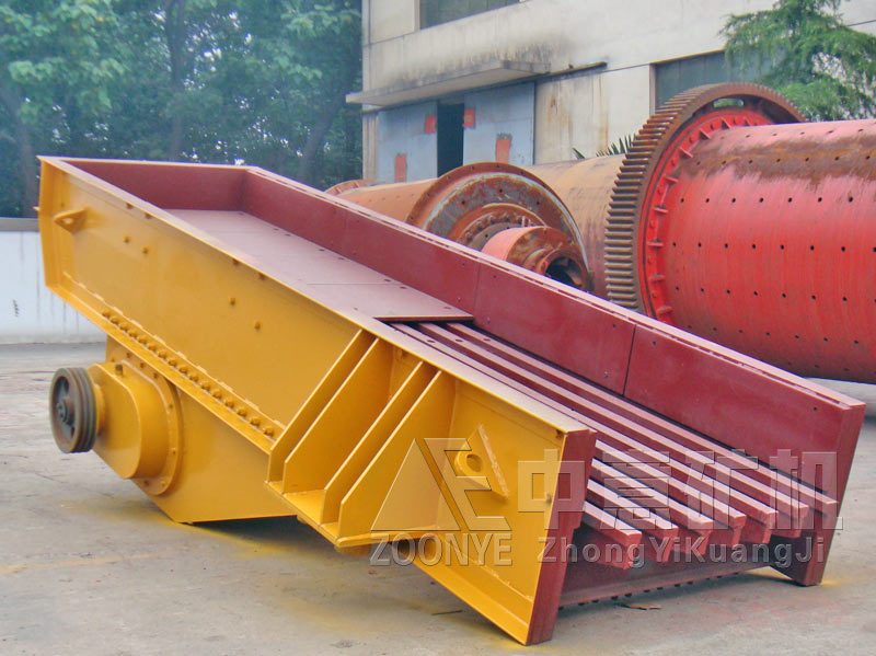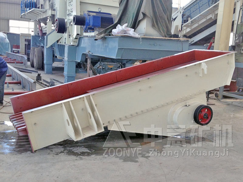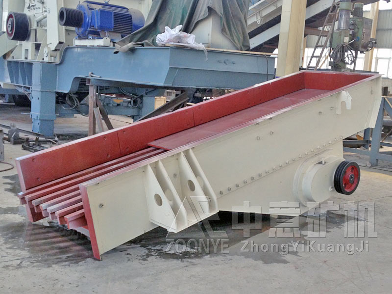 ZSW振動給料機是由給料槽體、激振器、彈簧支座、傳動裝置等組成。槽體振動給料的振動源是激振器,激振器是由兩根偏心軸(主、被動)和齒輪副組成,由電動機通過三角帶驅動主動軸,再由主動軸上齒輪嚙合被動軸轉動,主、被動軸同時反向旋轉,槽體振動,使物料連續(xù)不斷流動,達到輸送物料的目的。