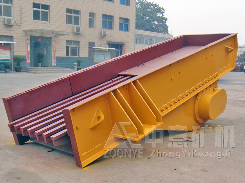 ZSW振動給料機是由給料槽體、激振器、彈簧支座、傳動裝置等組成。槽體振動給料的振動源是激振器,激振器是由兩根偏心軸(主、被動)和齒輪副組成,由電動機通過三角帶驅動主動軸,再由主動軸上齒輪嚙合被動軸轉動,主、被動軸同時反向旋轉,槽體振動,使物料連續(xù)不斷流動,達到輸送物料的目的。